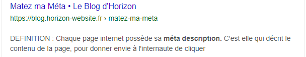 Elle doit résumer en 160 caractères maximum le contenu web de la page en question, pour donner envie à l’utilisateur d’en savoir plus.